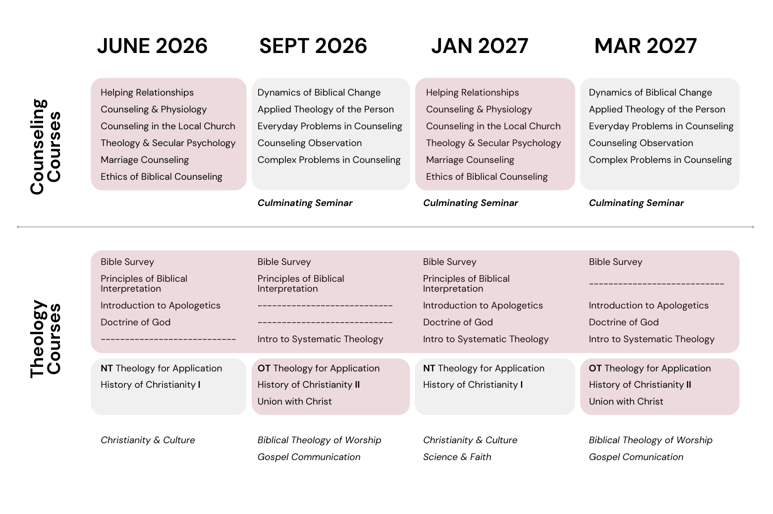 See the chart below to view course offerings for the 2026-2027 academic year. The 2026-2027 Academic year will take place from June 2026 - May 2027.