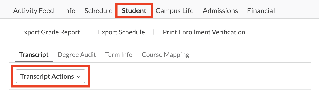 1) 팝퓰리 로그인 후 My Profile — Student Tab — Transcript Actions을 선택합니다.