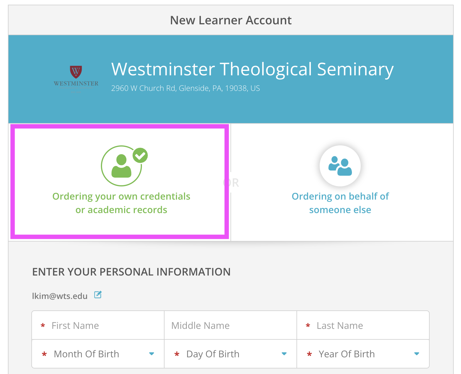 웨스트민스터 신학교는 Parchment와 함께 협력하여 소정의 수수료로 신속하고 철저한 보안이 적용된 공식 성적표를 발급하며, 학생이 지정한 수신인 또는 수신 기관으로 직접 전송하고 있습니다. 공식 성적표 발급을 위해서는 아래 링크를 통해 Parchment 사이트에 접속하신 후, 이메일을 적고 Continue 버튼을 누른 후 본인의 계정을 생성하시고 신청서를 작성하여 제출해 주셔야 합니다.