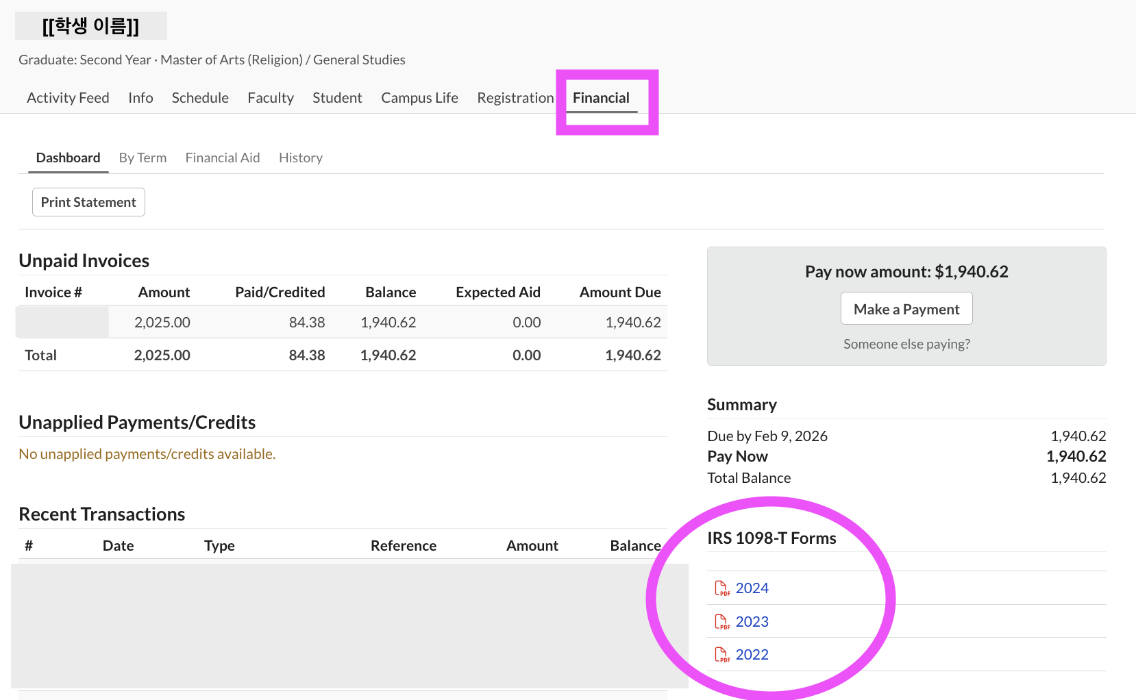 4) 납부해야 할 등록금 항목 아래에서 "IRS 1098-T Forms"를 확인한다.