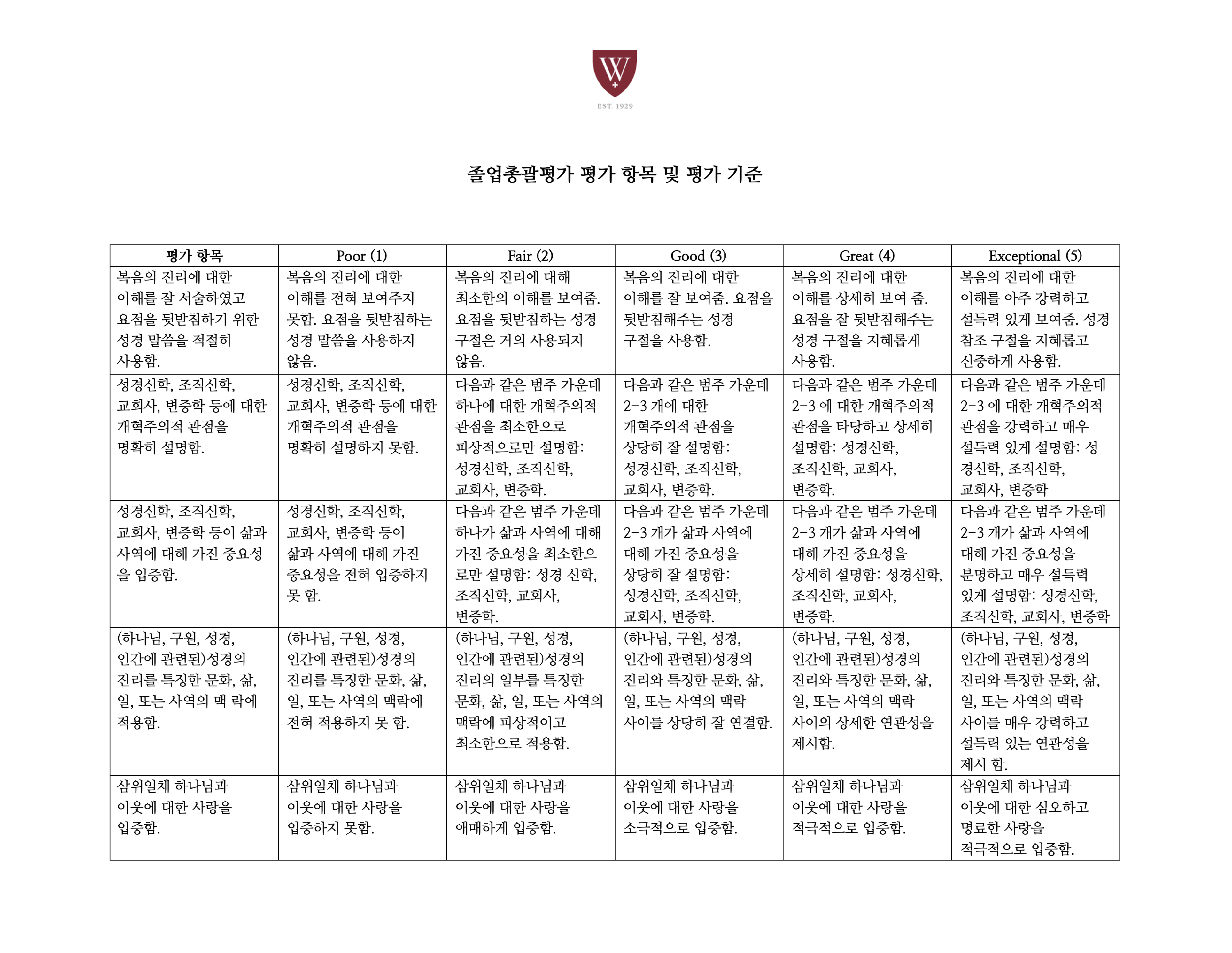 아래의 평가표는 WTS가 KMATS 커리큘럼의 성공과 여러분의 프로그램에서의 성공을 평가하게 될 지 표입니다. 여러분은 졸업총괄평가를 준비하는 과정에서 아래의 평가표를 항상 염두에 두어야 합니다. 2개 이상의 범주에서 “Poor” 점수를 받으면, 다시 제출할 것이 요구되고, 졸업 학기에 졸업 허가를 받지 못하게 될 것입니다.